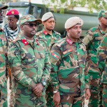 Taliyaha Ciidanka Xoogga Dalka Soomaaliyeed, Sarreeye Guuto Ibraahim Maxamed Maxamuud, oo ay wehliyaan Taliyaha Ciidanka Booliiska Soomaaliyeed Jeneraal Asad Cusmaan Cabdullaahi, Taliyaha Ciidanka Badda iyo Difaaca Xeebaha XDS Jeneraal Cabdiwahaab Ca